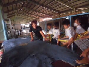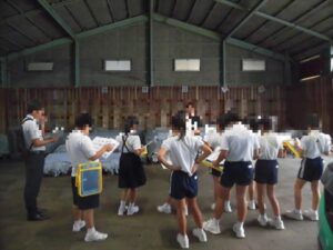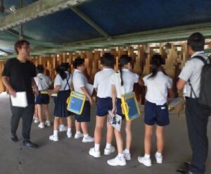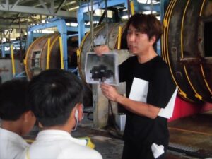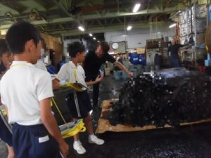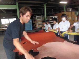 たつの市の地場産業である皮革について、工場見学を通して学びました。たつのの革は、プロ野球選手が使うグローブにも利用されていて、とても有名です。また、カバンやベルト、服にも利用されています。どのような工程で、皮から革になるのか、実際に工場での作業の様子を見ながら学ぶことができました。