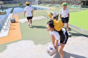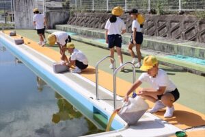 3年生は、環境学習の一環としてEM菌を作り、プールへ投入しています。プールの水をEM菌を投入することで、自然環境に有用な働きをします。EM菌とは、乳酸菌・酵母・光合成細菌などの微生物の集まりです。プールの水を排水するときには、水質浄化されています。