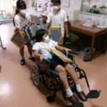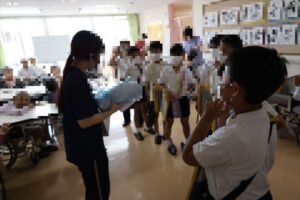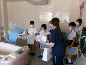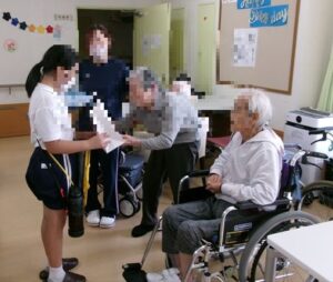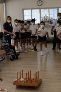 3年生は、特別養護老人ホーム「揖保の郷」へ訪問し、校区内にある施設について学びました。実際に施設内を見学させてもらったり、デーサービスを利用されている方と交流したりしました。お年寄りのみなさんは、私たちが行くと、とても喜んでくださり、元気が出たと言ってくださいました。車いすの体験や輪投げをさせていただきました。
