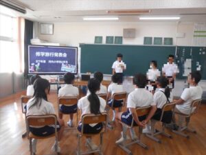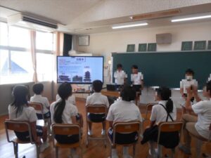 6年生は、奈良・京都への1泊2日の修学旅行を5年生を対象に発表をおこないました。歴史と文化に触れたことを来年に修学旅行へ行く5年生へ伝えることは、とても効果的で、興味深い会になりました。6年生は、学んだことや思い出をしっかりと振り返る機会となり、5年生は、修学旅行への期待が大きく膨らむ場となりました。たいへん和やかで、楽しい会となりました。