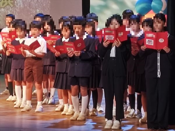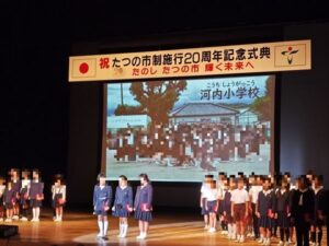 たつの市の市制20周年記念式典に、河内小学校6年児童3人が代表して、参加しました。たつの市内にある小学校が集まり、それぞれの学校紹介をおこないました。