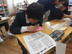 点字体験をおこないました。福祉教育の一環で、実際に点字を打ってみました。指先で触った感覚で、並びから言葉を読み取ることが、本当にすごいなと感じました。言葉でも手話や点字でも、相手とコミュニケーションをとりたいという強い思いが大切だなと感じました。