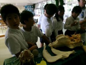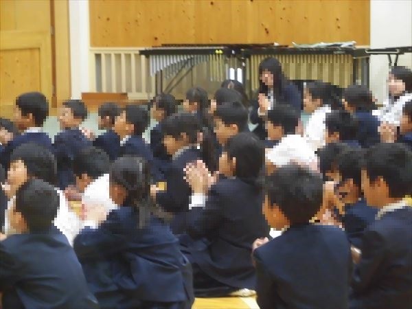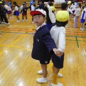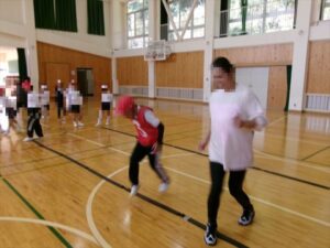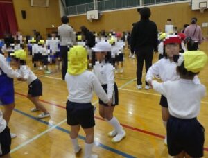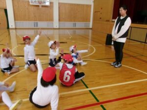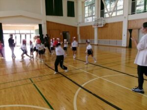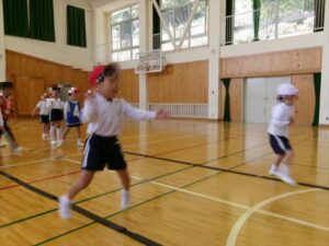 1・2年生で、リズムジャンプの体験をおこないました。音楽のリズムに合わせて、ラインに沿って、ひとりひとりいろいろなジャンプをしながら進んでいきます。汗いっぱいかきながら、体をリズムよく動かしていきました。